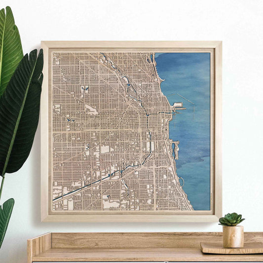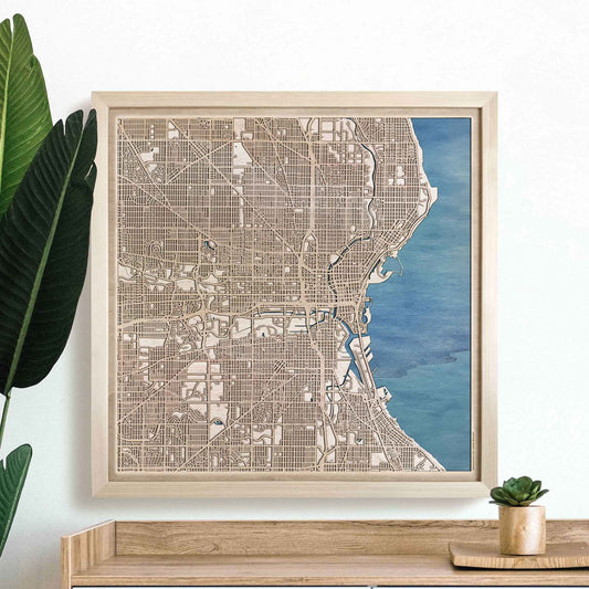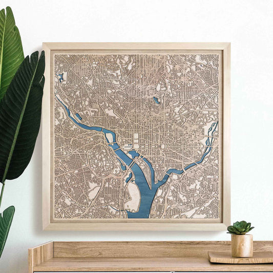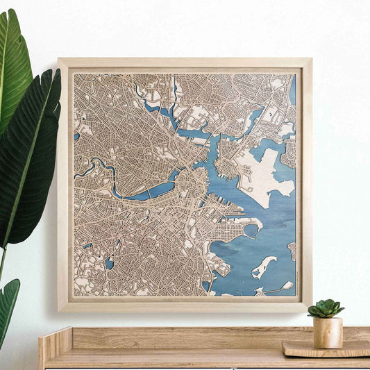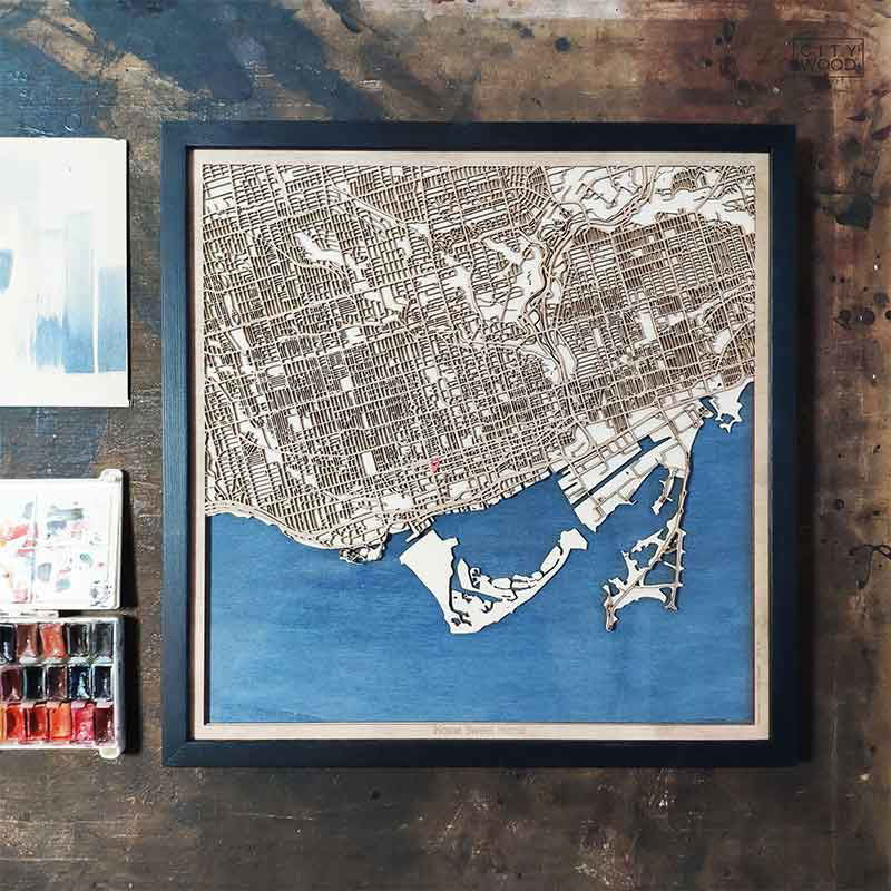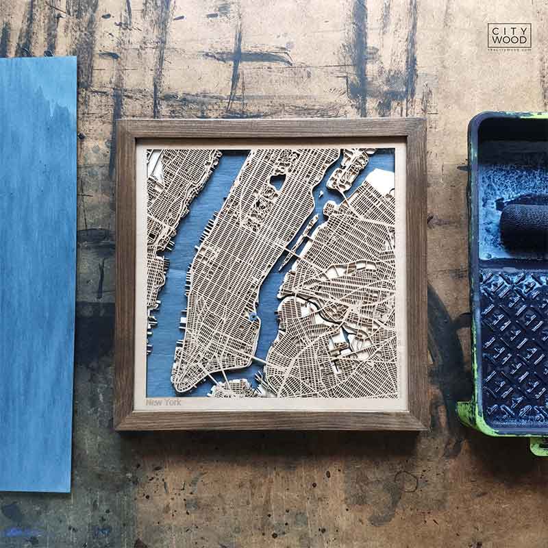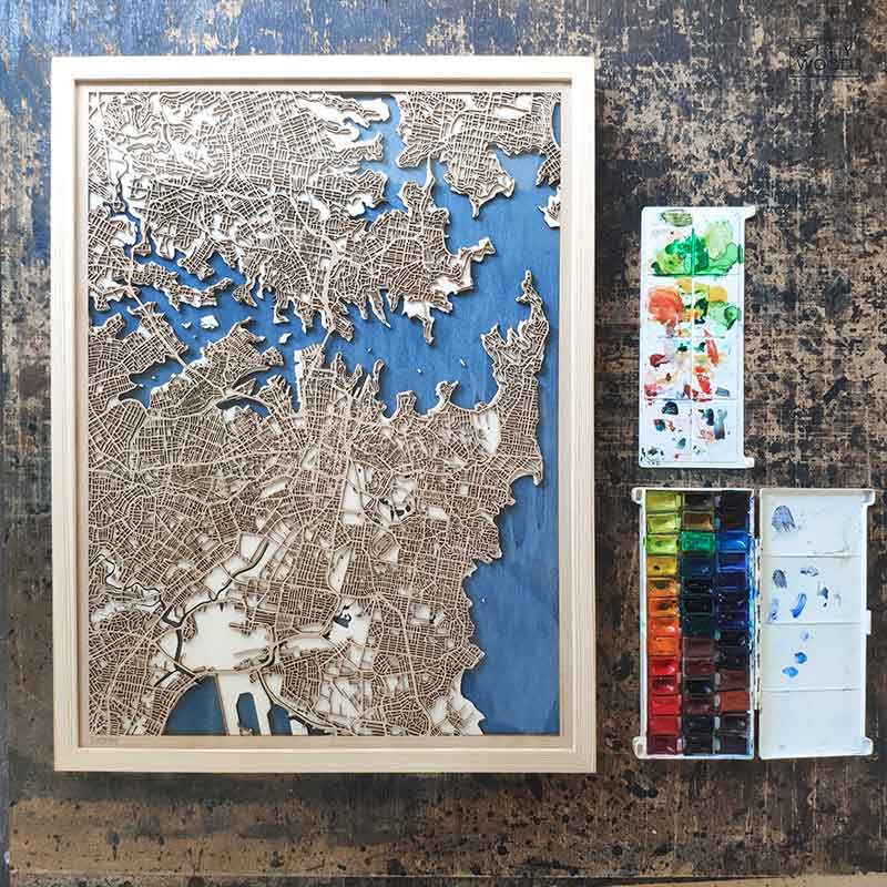 CityWood wird aus Stadtdaten erstellt, die in den Computer übertragen werden. Merkmale wie Straßen und Flüsse werden in Sperrholzschichten umgewandelt, um dem Design Tiefe zu verleihen.